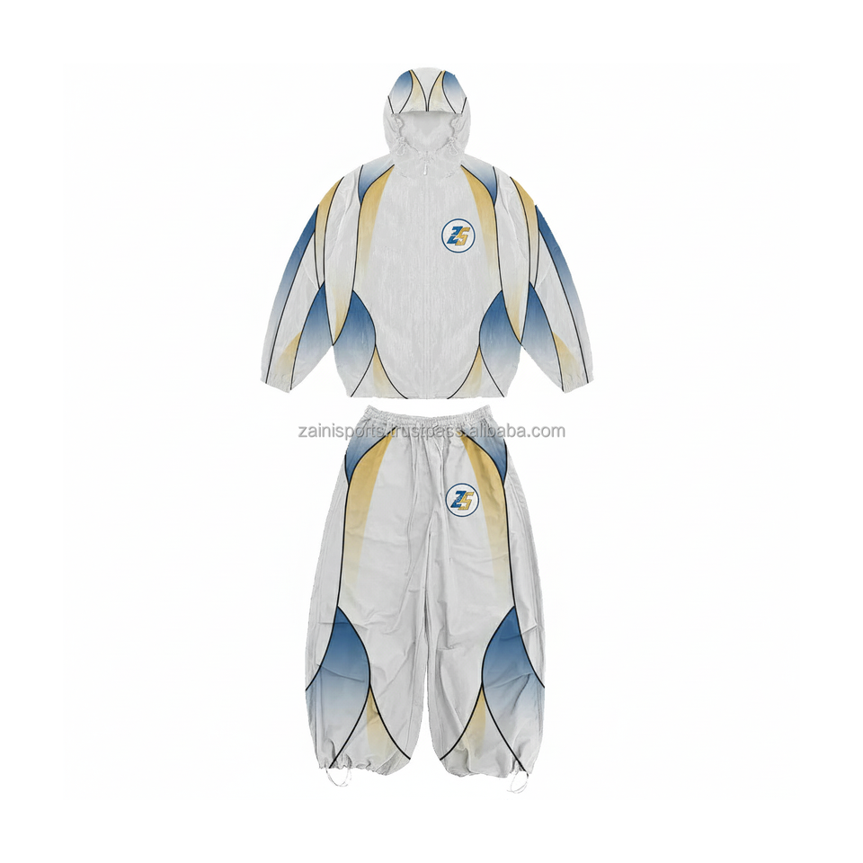Survêtement coupe-vent élégant en polyester 160GSM lisse, doux au toucher, dégradé, jaune, bleu, panneaux, logo personnalisé, thermoscellage, grande taille