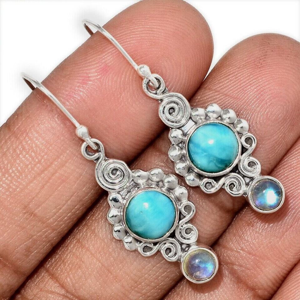 Boucles d'oreilles élégantes en argent sterling 925 véritable forme ronde Larimar et Labradorite Boucles d'oreilles pendantes en argent Bijoux ODM Fournisseur OEM