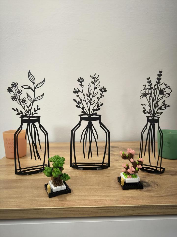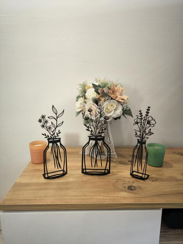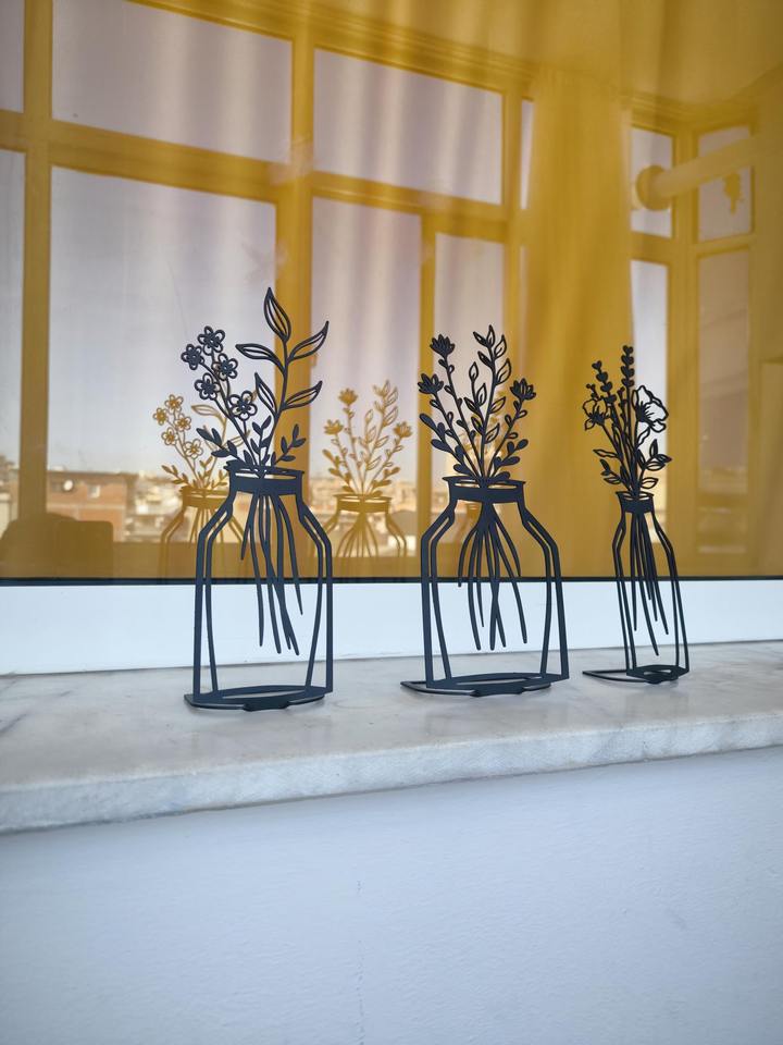 Objet de décoration élégant en métal noir, avec trois motifs de vases à fleurs, idéal pour les tables de salon, de chambre et de couloir, provenant d'Inde.