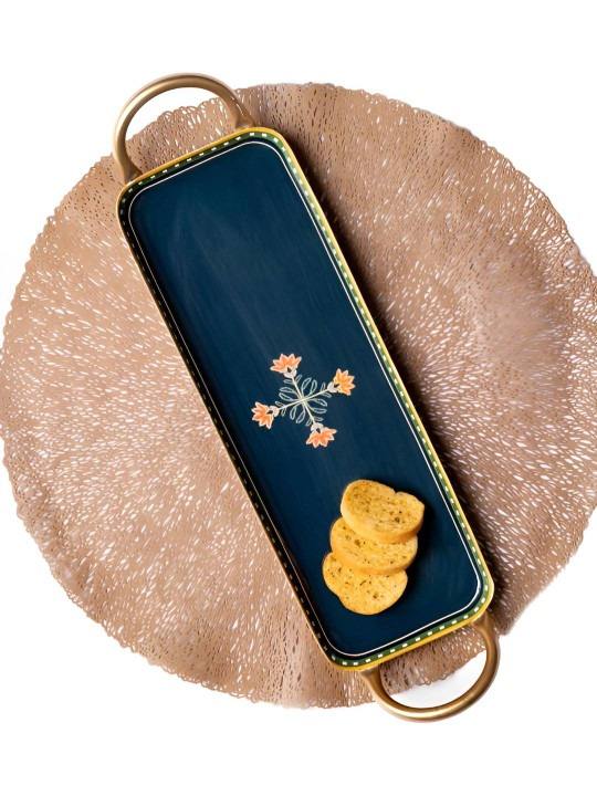 Plateau de service rectangulaire en métal bleu élégant avec des détails de créateur adaptés aux dîners de luxe et à l'utilisation quotidienne