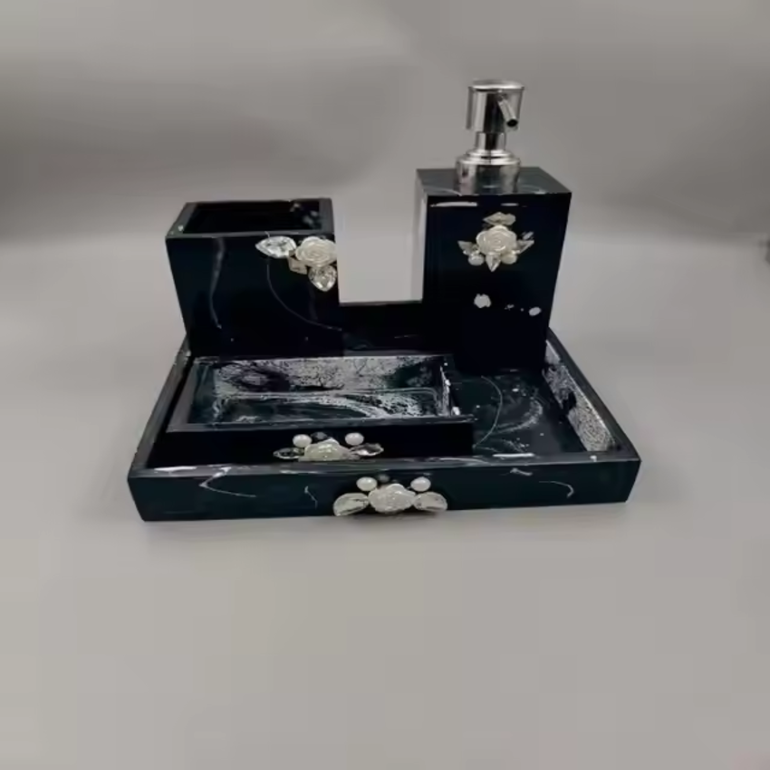 Ensemble de salle de bain en résine stylisé organisateur de coiffeuse de luxe porte-savon porte-brosse à dents plateau de gobelet fait à la main essentiel moderne