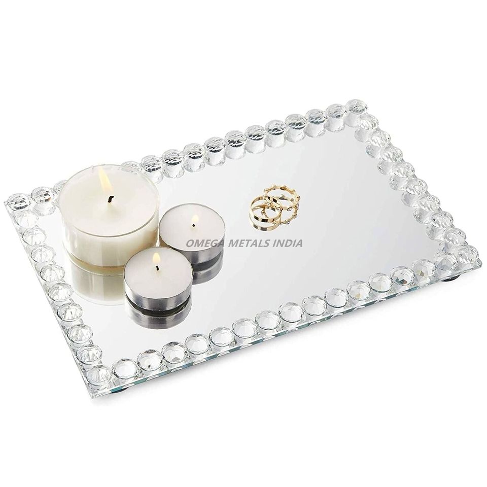 Plateau de service rectangulaire doré élégant avec base en miroir et poignées élégantes, parfait pour présenter des boissons et des collations