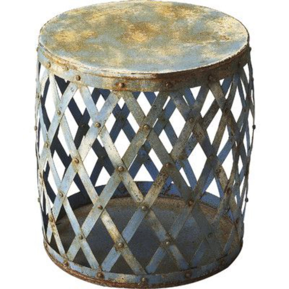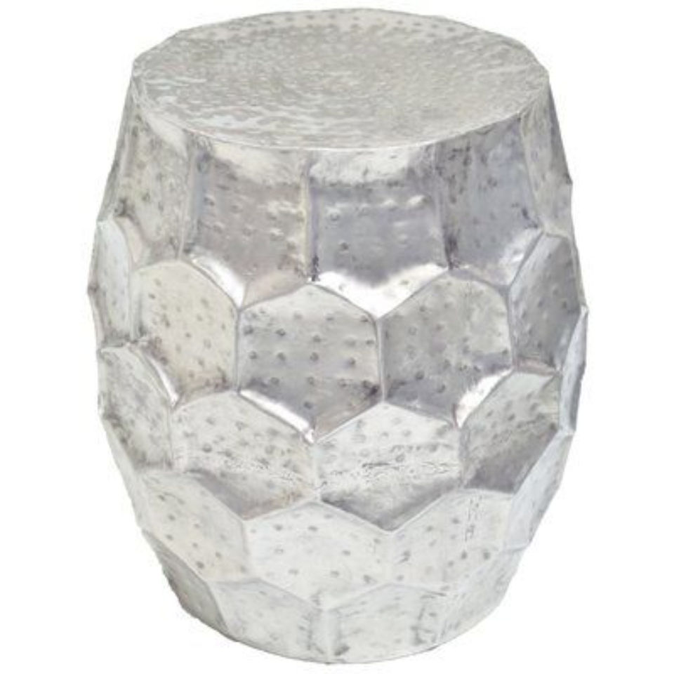 Tabouret élégant en métal martelé avec plateau rond en bois, finition argentée, table d'appoint décorative en aluminium avec accent sablier, mobilier d'intérieur