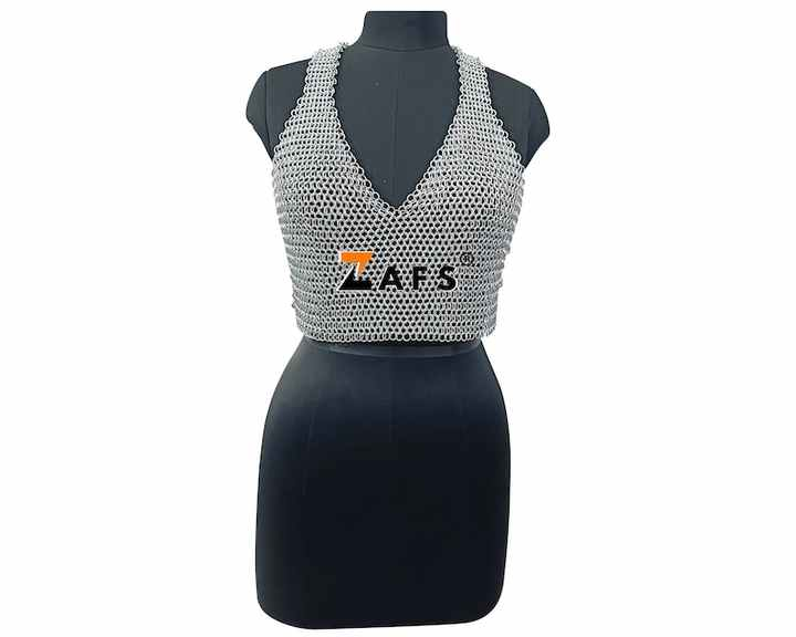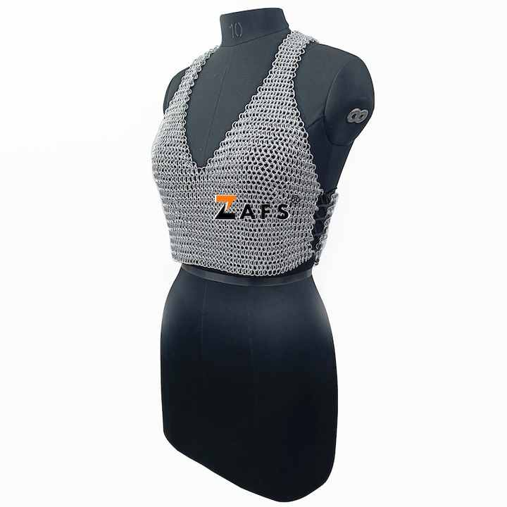 Soutien-gorge médiéval élégant en maille haut en aluminium anneau bout à bout sangle spaghetti conception unique à franges tenue de festival armure polie