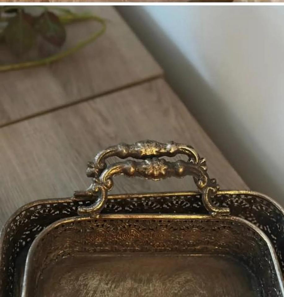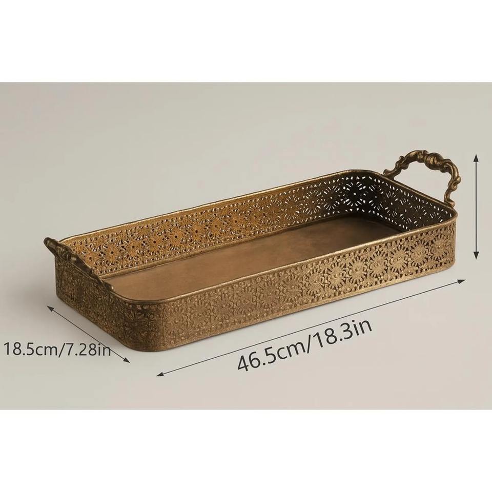 Plateau de service rectangulaire élégant en métal doré avec un design orné et des poignées, parfait pour servir des boissons et décorer la maison, provenant d'Inde.