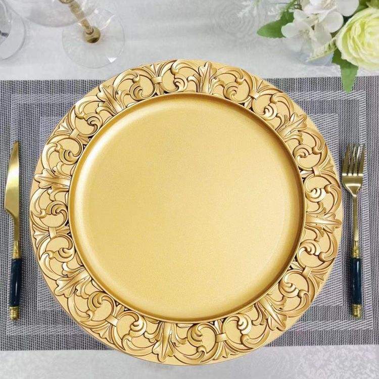 Assiette de présentation dorée en métal au design moderne et élégant, forme irrégulière faite à la main pour la décoration de table de banquet, hôtel, restaurant