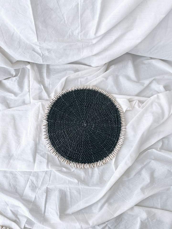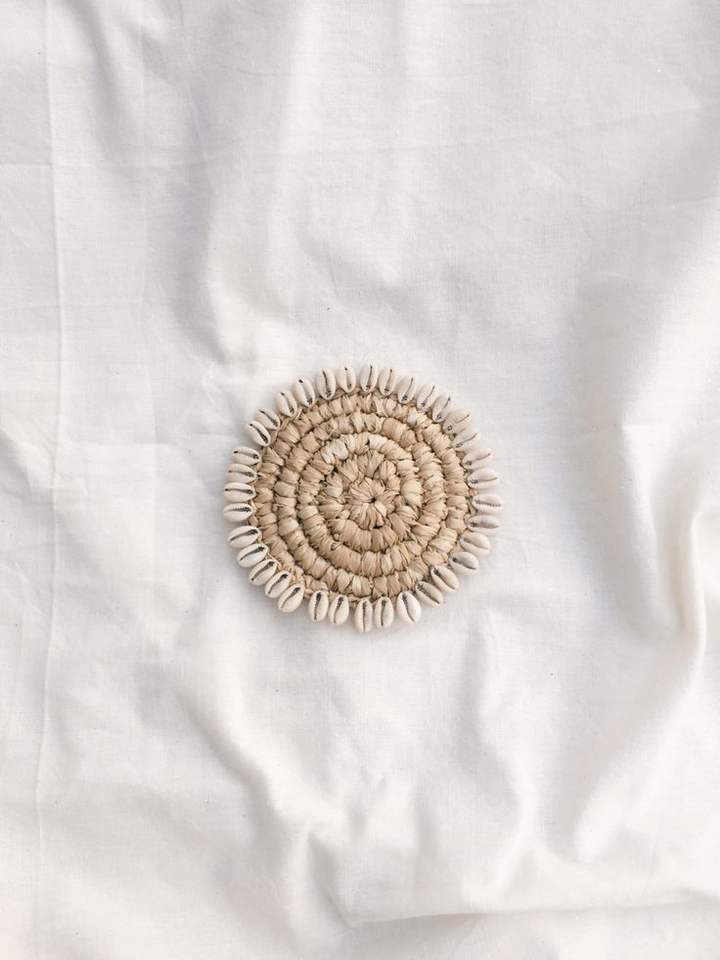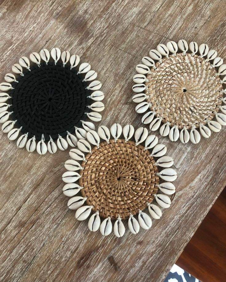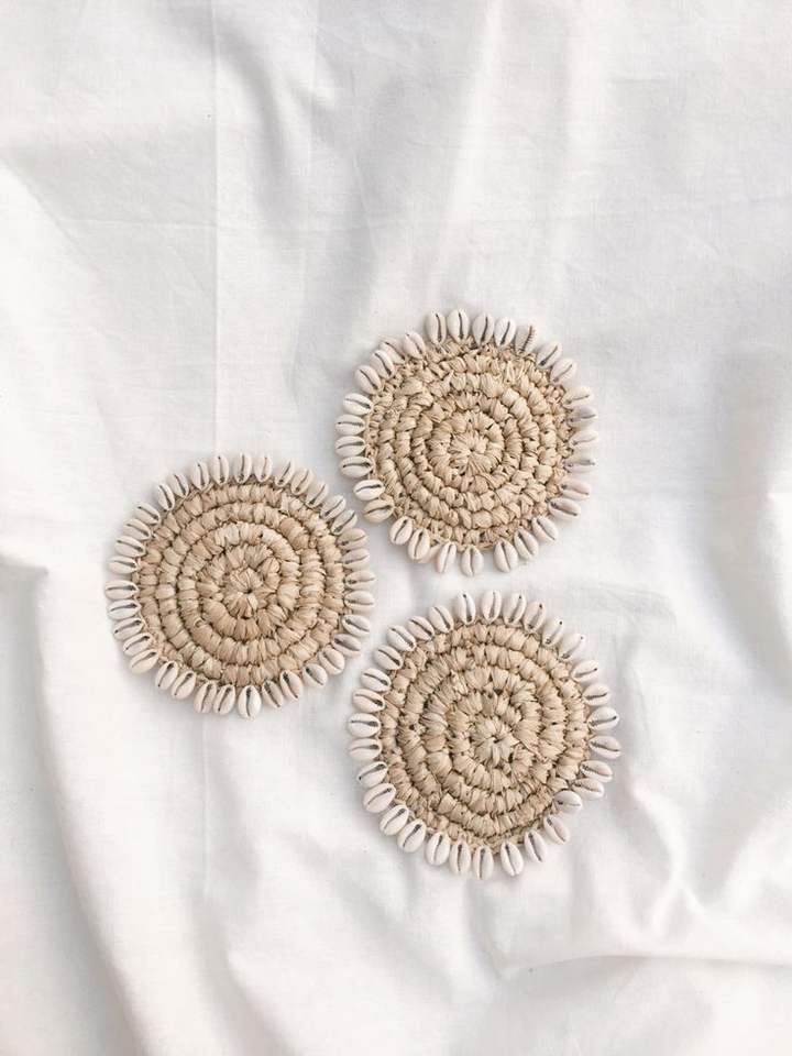 Sous-verres en raphia élégants ornés de coquillages marins, tapis de table écologiques en fibres naturelles tissées style bohème, pour tasses, mugs, décoration de salon tropical ou de plage