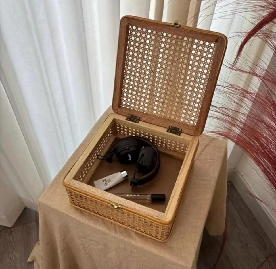 Panier de rangement élégant en rotin avec serrure, idéal pour l'organisation du maquillage et des accessoires essentiels dans le placard, provenant d'Inde