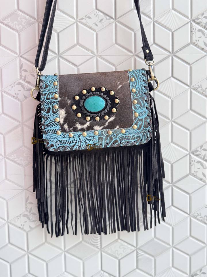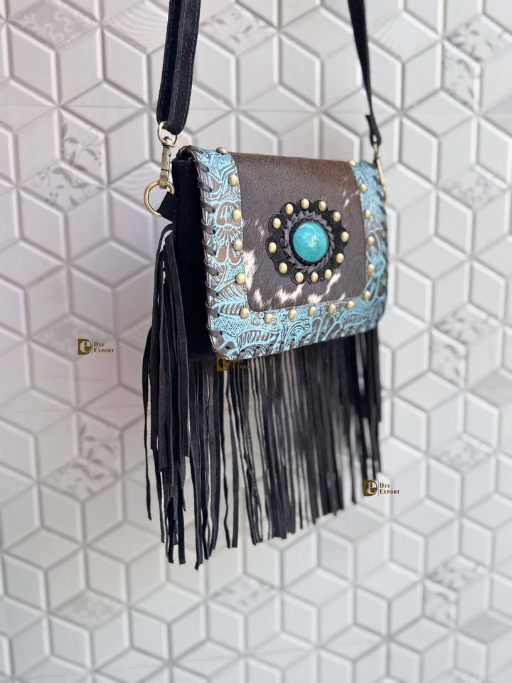 Élégant véritable peau de vache frange sac à main Turquoise pierre multi-usages fronde gitane Boho Vintage Design fait à la main nouveau bouton gland