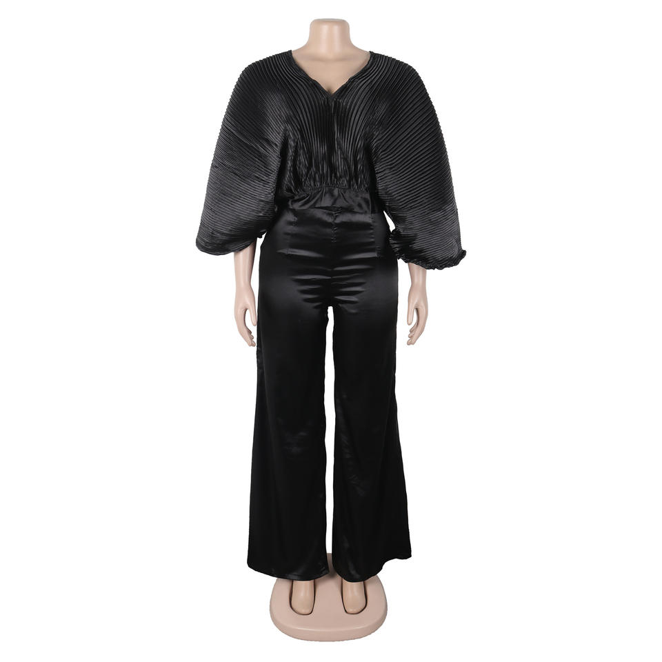 Ensemble deux pièces pour femme, chemisier élégant à col en V plissé et à manches bouffantes, pantalon taille haute, tendance
