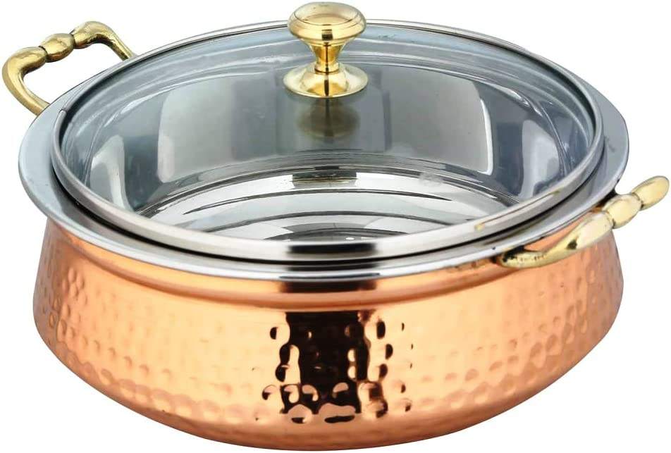 Batterie de cuisine indienne traditionnelle élégante Base en cuivre martelé Couvercle en verre Passe au lave-vaisselle Durable Facile d'entretien Restauration à domicile