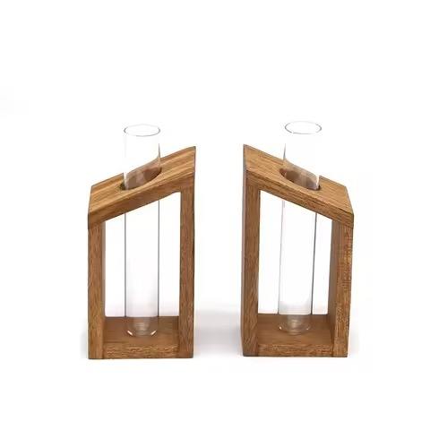 Vase à fleurs en verre élégant et raffiné avec support en bois, finition naturelle, qualité de vente élevée, vase en bois moderne