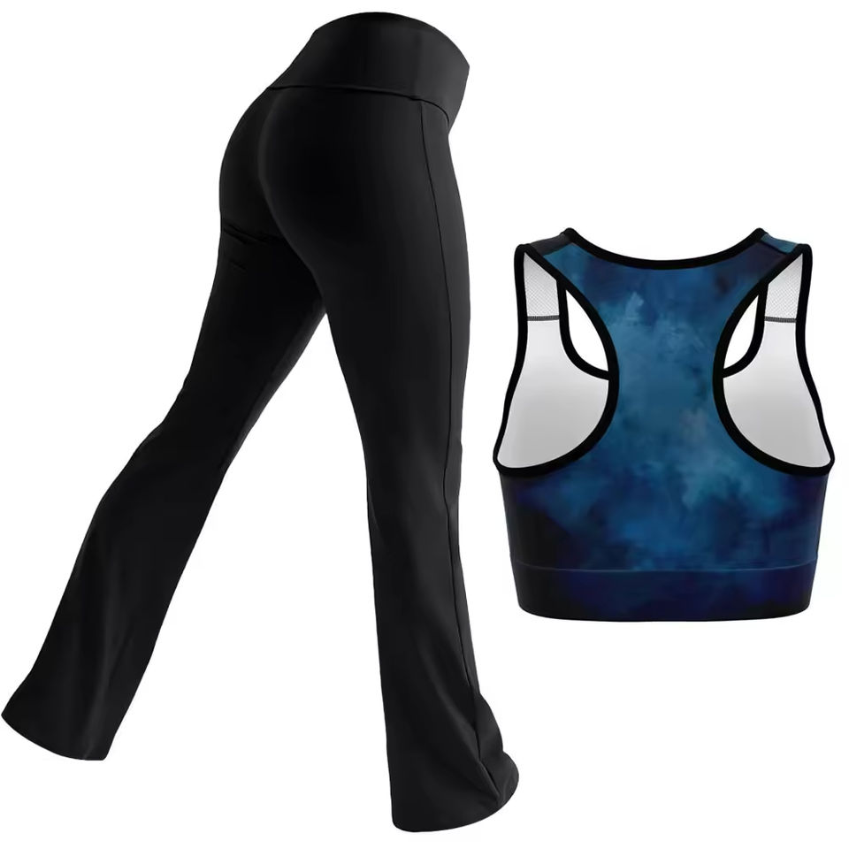 Ensemble de sport pour femme : Soutien-gorge court dos nageur uni et Legging de yoga évasé long en Spandex/Nylon, taille haute, taille élastique, respirant