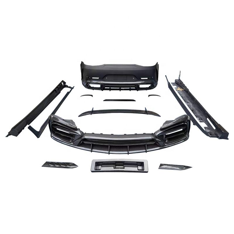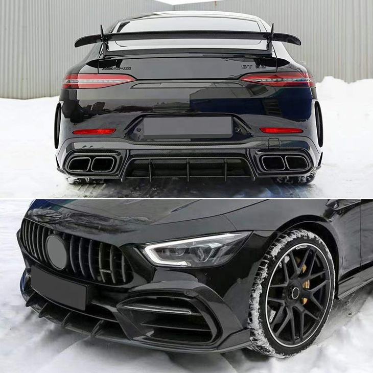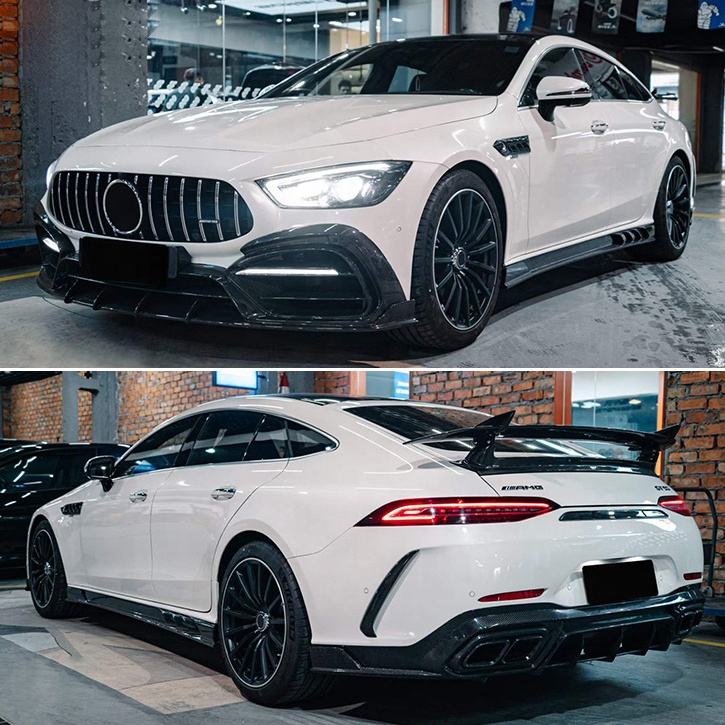 Kit d'enveloppement en fibre de carbone TOPCA modifié pour Mercedes-Benz AMG GT 50 53 63S, comprenant un spoiler avant et arrière, et une aile arrière.