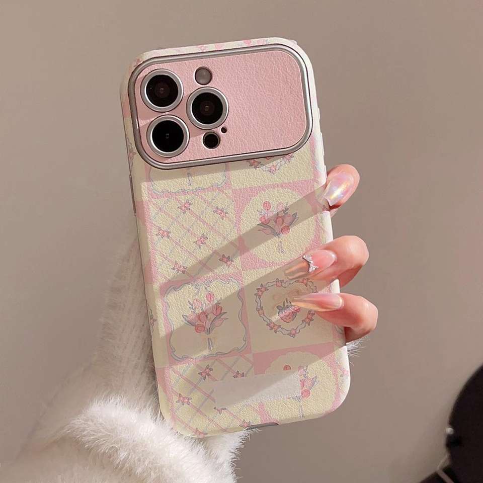 Coque de téléphone antichoc en simili cuir à carreaux argentés et fleurs