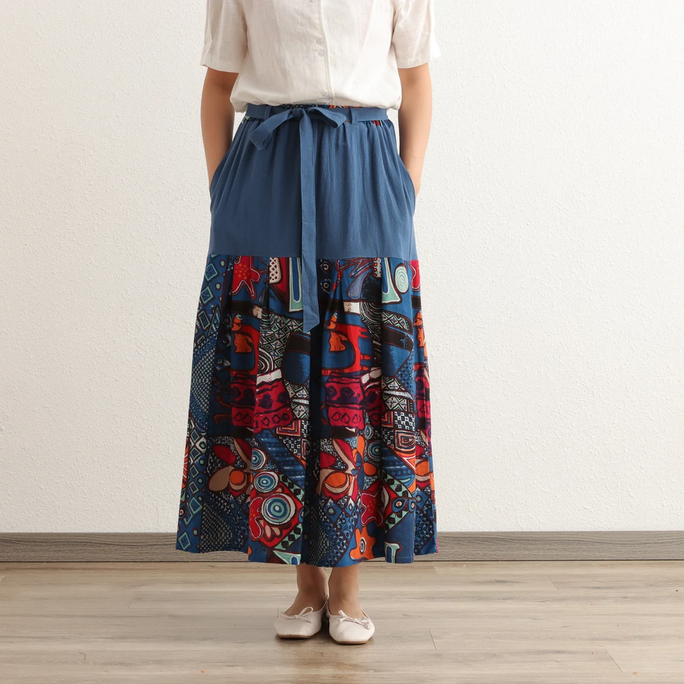 Jupe Maxi d'été plissée à taille élastique 100% Coton Casual Flared Loose Printed Design