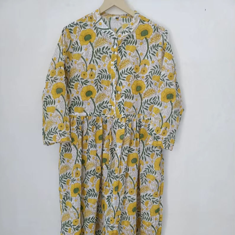 Summer Bohemian Long Dress Pure Cotton Hand Block Printed Indian Style Handmade Ethical Fashion Casual Daywear Gift