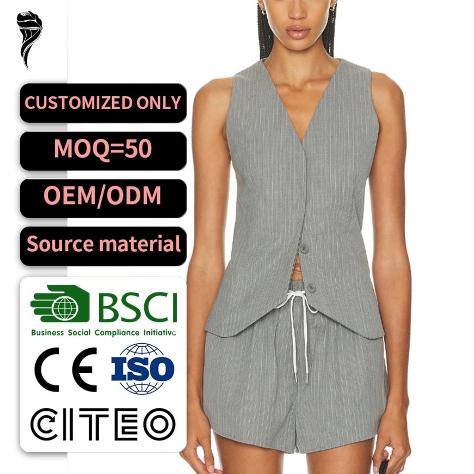 Ensemble deux pièces en lin personnalisé avec logo pour l'été – Haut en lin décontracté et sexy à col en V profond, short en lin taille haute élastique coupe trapèze – Ensemble professionnel en lin