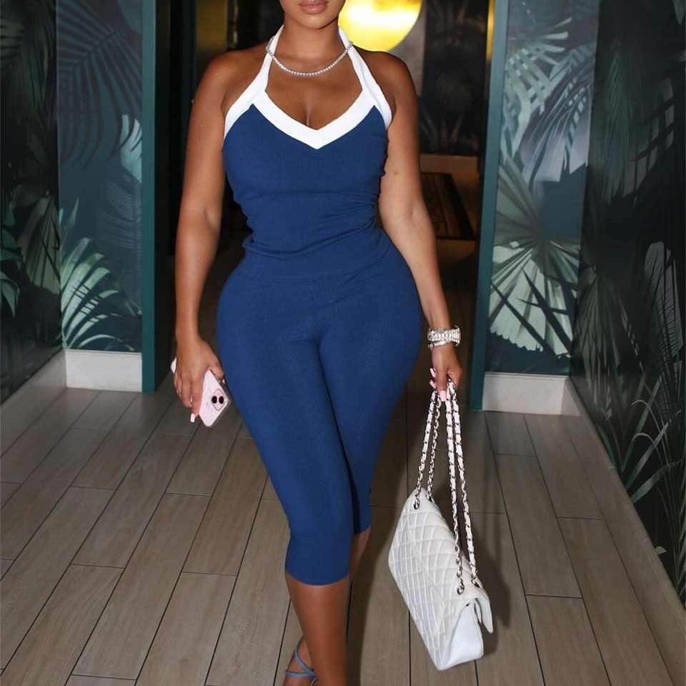 Combinaison mini moulante extensible pour femme, dos nu, bretelles halter, couleurs contrastées, tendance été