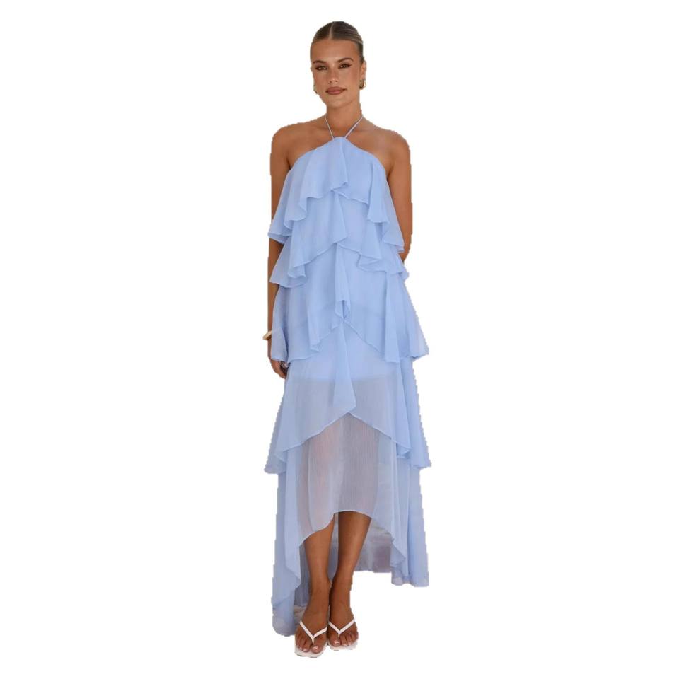 Robe longue d'été en mousseline florale à col halter sans manches avec volants superposés pour femme, idéale pour les fêtes à la plage