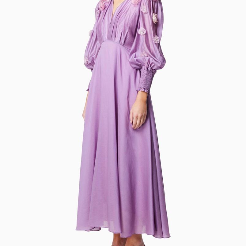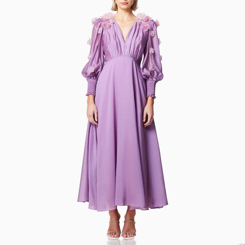 Robe d'été longue décontractée haut de gamme pour femme Robe longue élégante à col en V et fleurs à la main pour femme