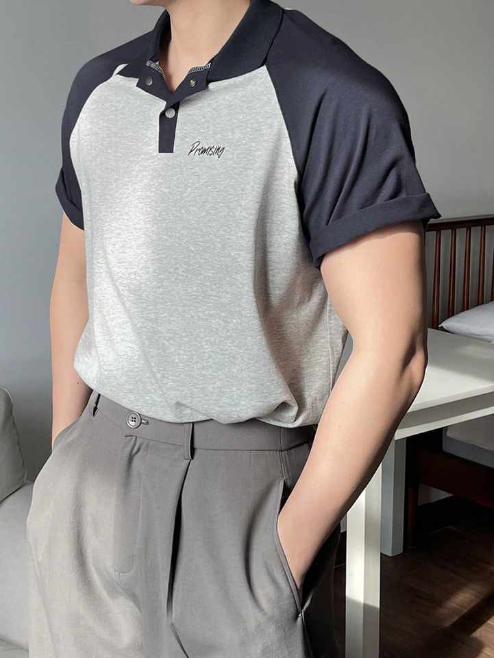 Polo d'été pour homme avec imprimé lettres et blocs de couleur gris et bleu