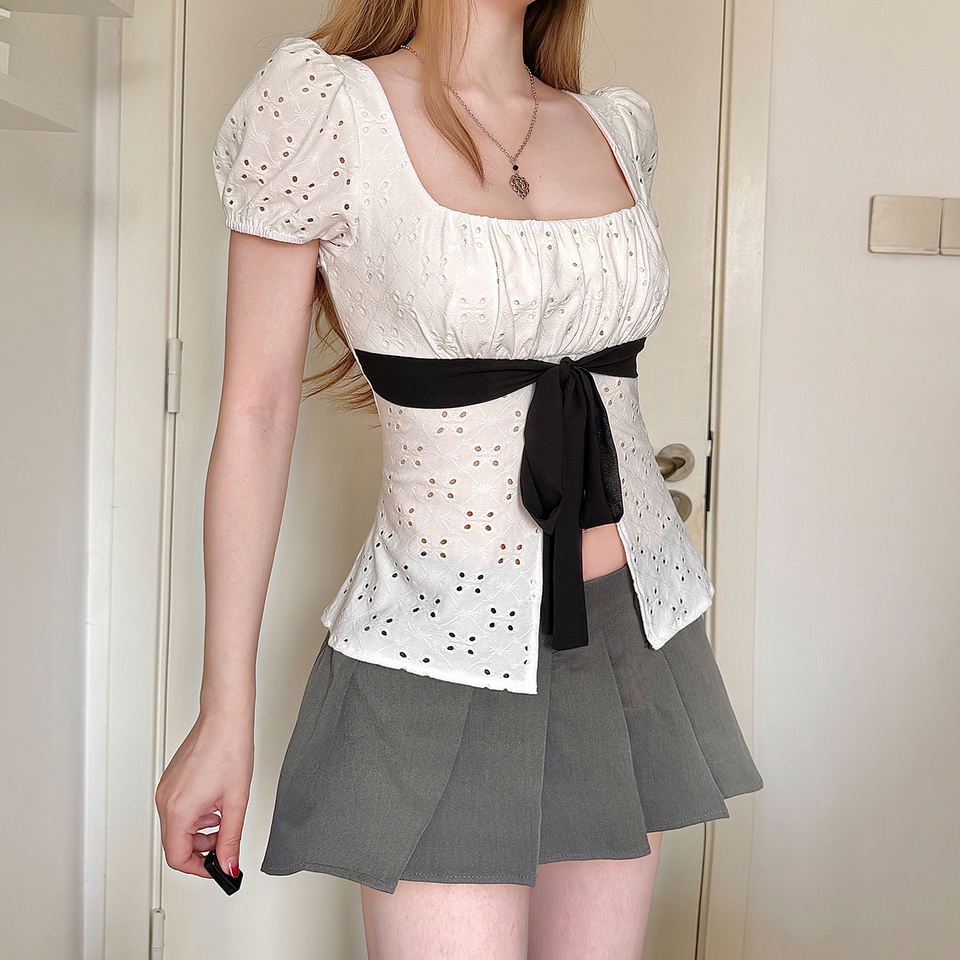 Nouvelle Blouse d'été pour Femme à Col Carré, Manches Bouffantes, Broderie Anglaise Française et Nœud à la Taille, Style Doux