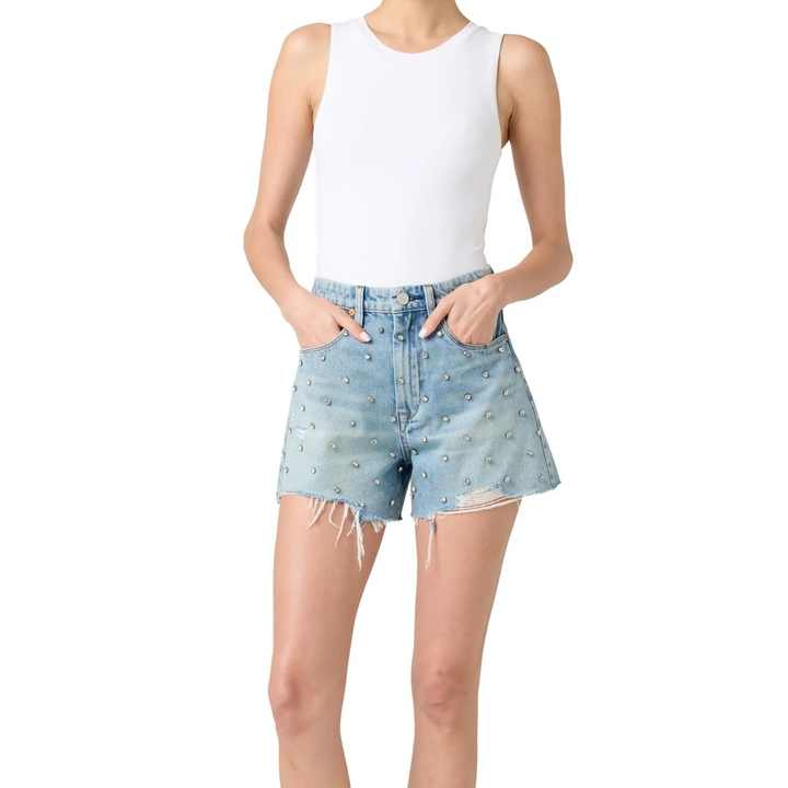 Nouveauté été : Short en jean taille haute orné de strass, personnalisable avec logo, respirant, pour femme