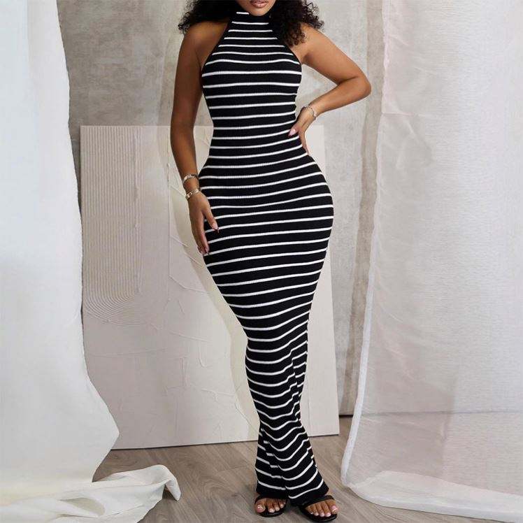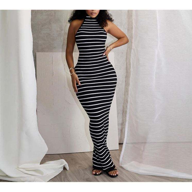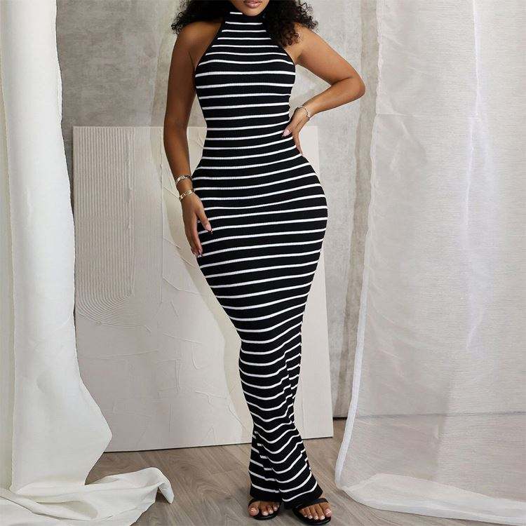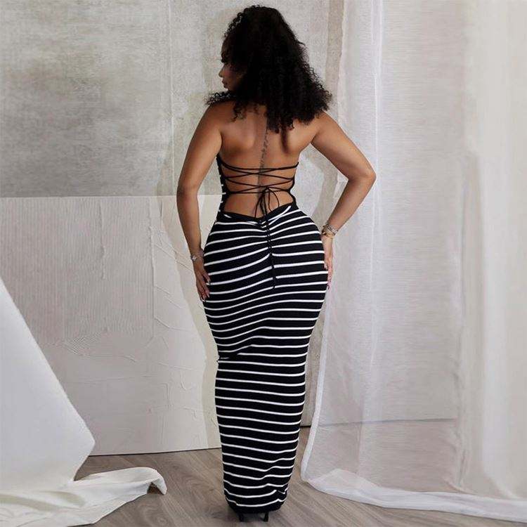 Été Nouveau Style Robe dos nu à lacets à haute élasticité rayée européenne et américaine pour les femmes Exclusive