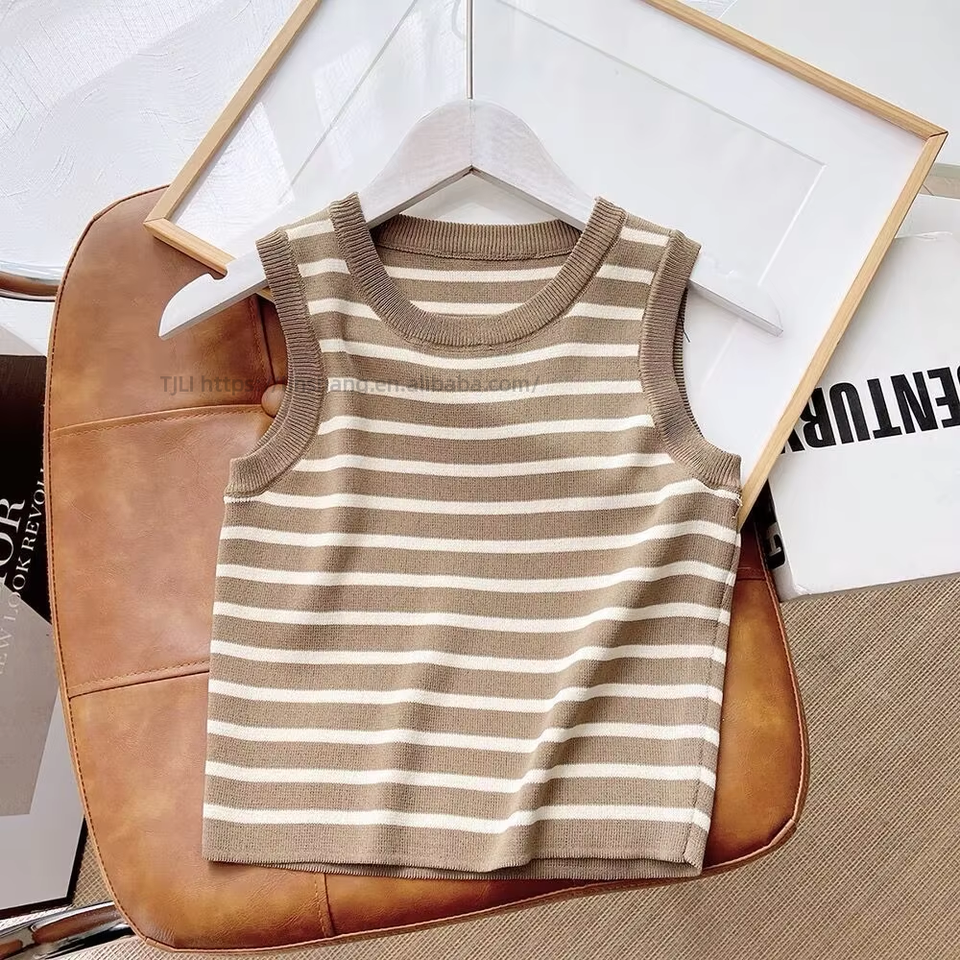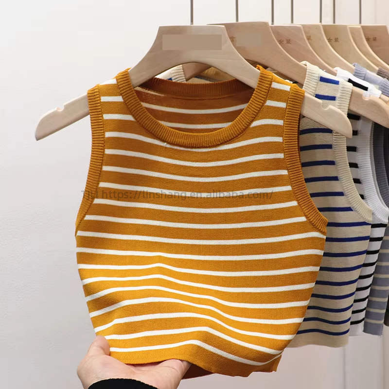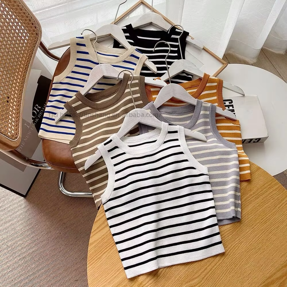 Haut d'été tricoté sans manches à rayures en soie glacée pour femme, style débardeur halter tendance