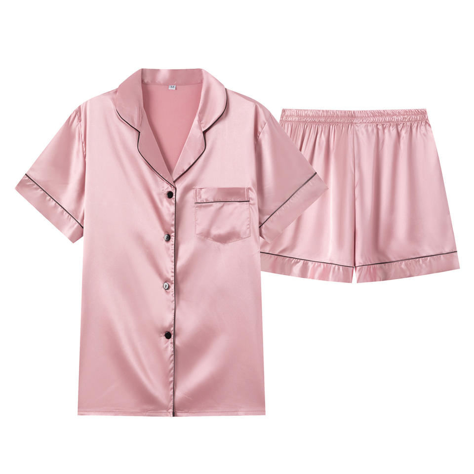 Ensemble d'été court en satin PJ avec ouverture boutonnée Ladies Lounge Wear Ensemble de pyjama rose brillant Boutons de passepoil délicats Taille élastique