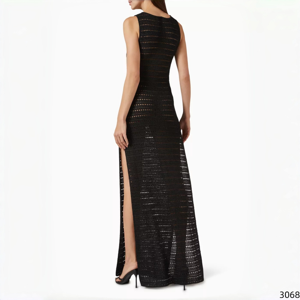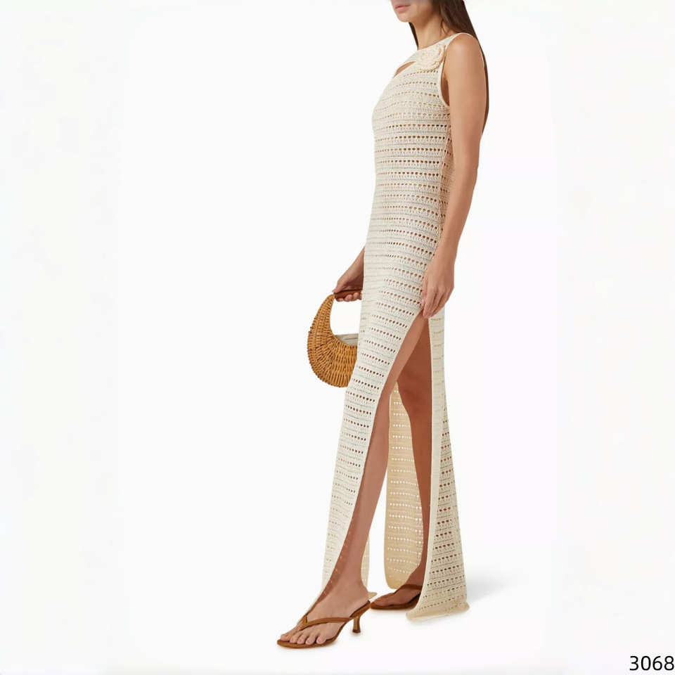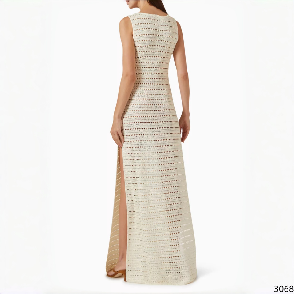 Robe longue d'été en crochet tricoté couleur unie, sans manches, avec découpe au col, cache-maillot de plage, fentes latérales doubles pour femme
