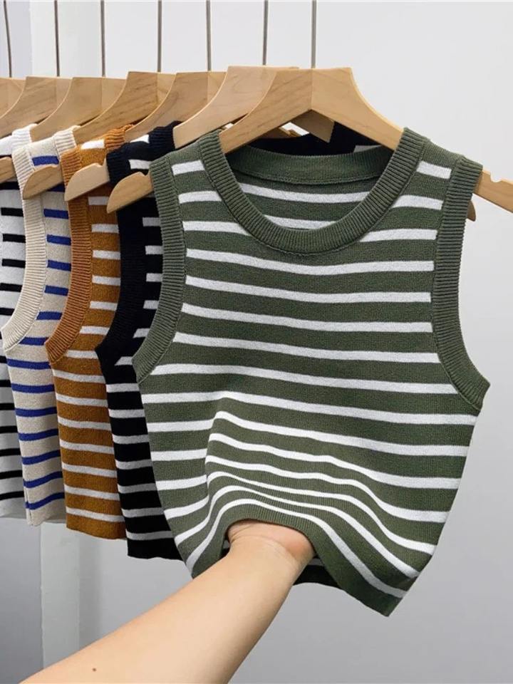 Été Printemps Débardeurs rayés Femmes T-shirts tricotés sans manches Crop Tops Femme Elastique Slim Casual Gilets Pullover