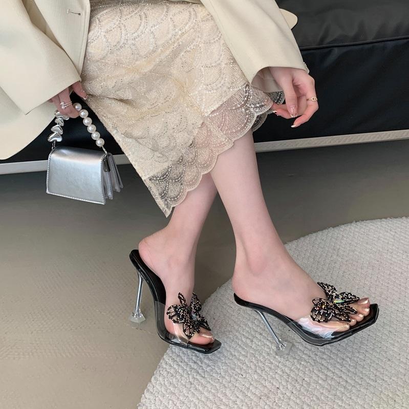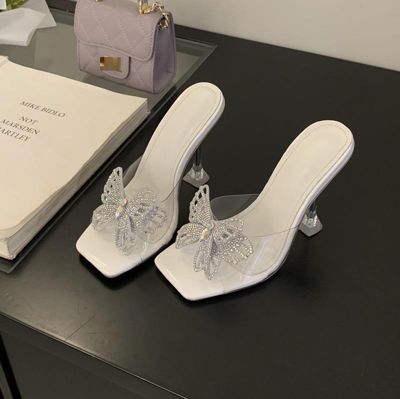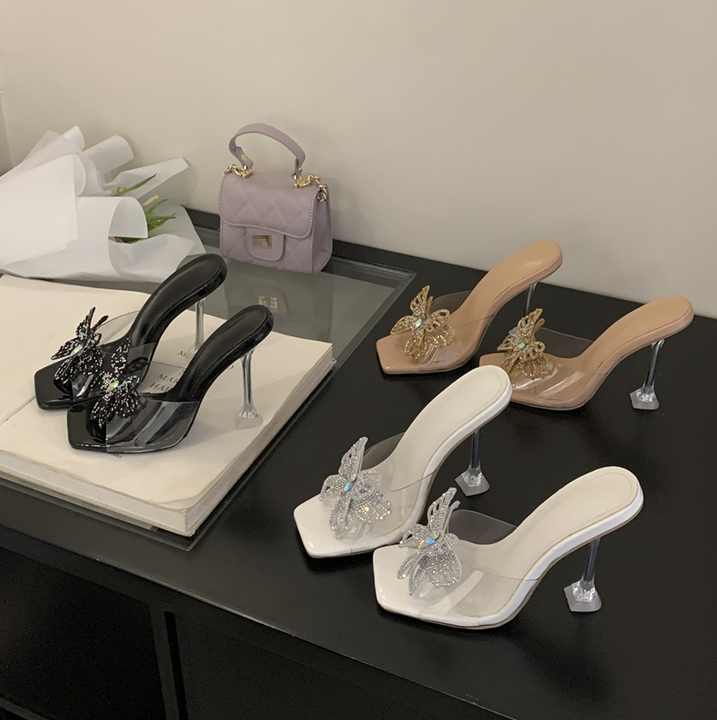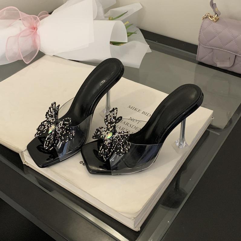 Sandales d'été à talons originaux pour femmes, avec strass, bout carré, chaussures de soirée transparentes