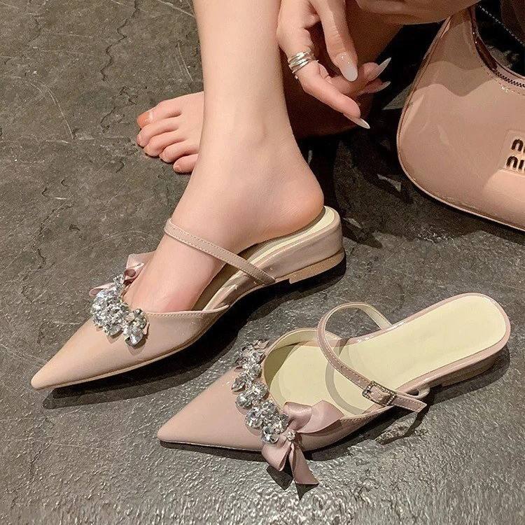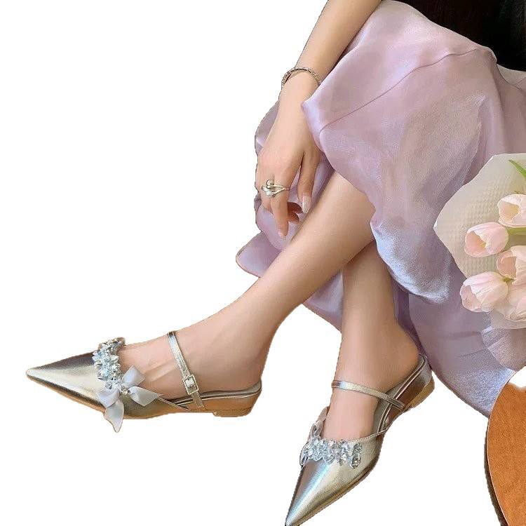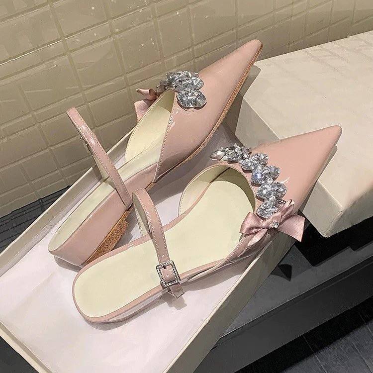 Chaussures de mariage élégantes et sexy pour l'été, mules à bout pointu avec nœuds en sequins goutte d'eau à la française et talons compensés Evergreen à brin unique