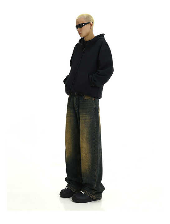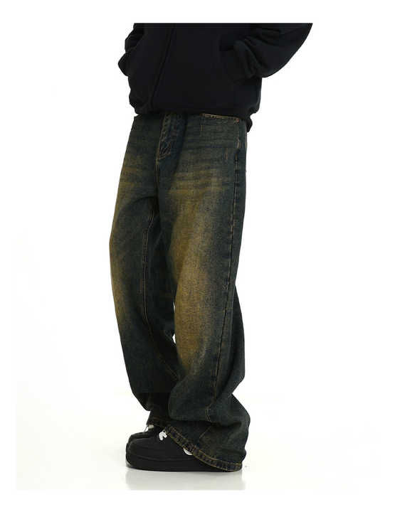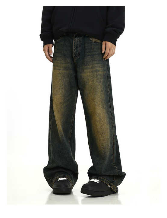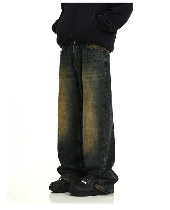 Jean en denim délavé effet soleil pour homme, coupe droite et large, style streetwear, décontracté et ample, pour l'été et l'hiver, méthode de tissage