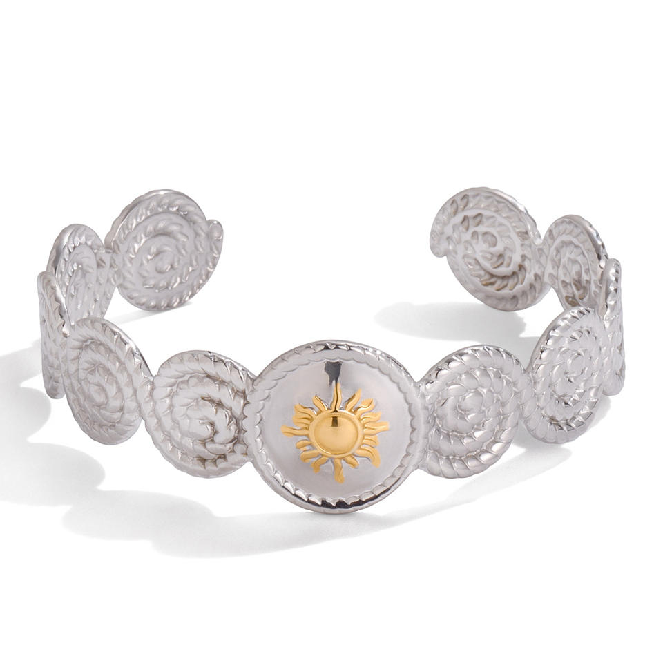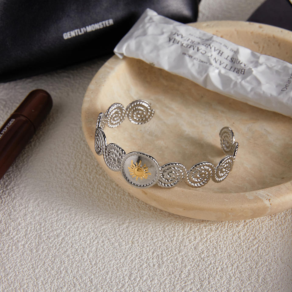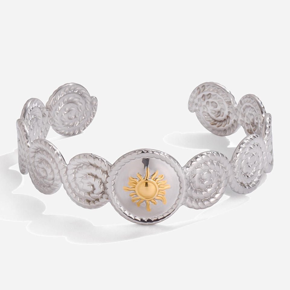Bracelet en argent à motif soleil avec incrustation dorée, design géométrique, unisexe, à porter au quotidien