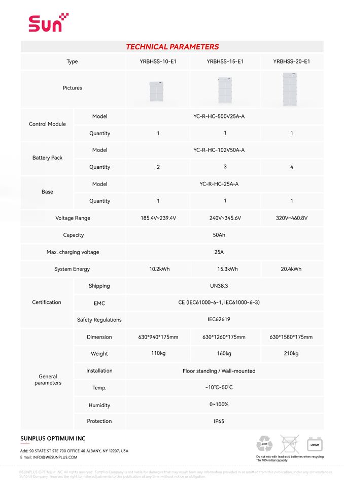 Batterie au phosphate de fer de lithium SunPlus 15KWH 51.2V, protection IP65, hybride, empilable, certifiée WiFi/Bluetooth pour une utilisation domestique