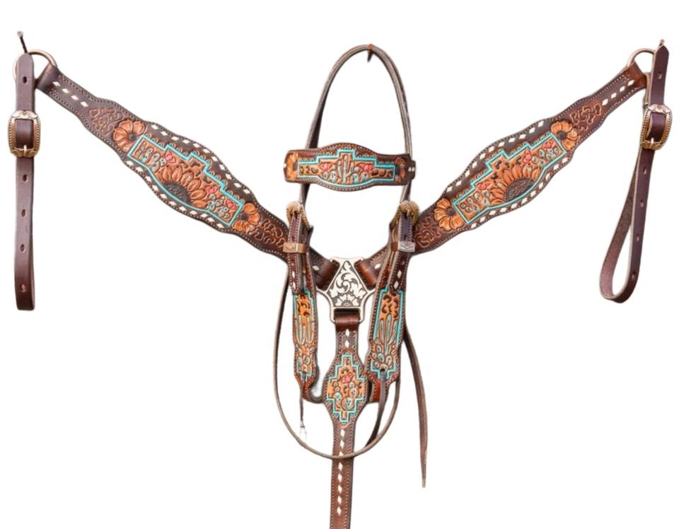 Sunflower Tooled Cactus Teal Horse Tack Set Genuine Leather English Saddle Lightweight Seasonal Riding Equipment Including