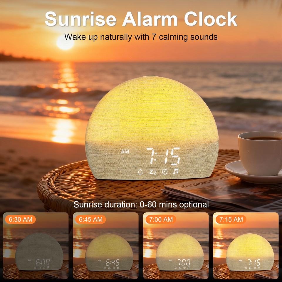 Réveil avec lever de soleil, 30 sons apaisants, lumière nocturne RVB, luminosité réglable sur 10 niveaux, 16 réglages de volume pour le sommeil