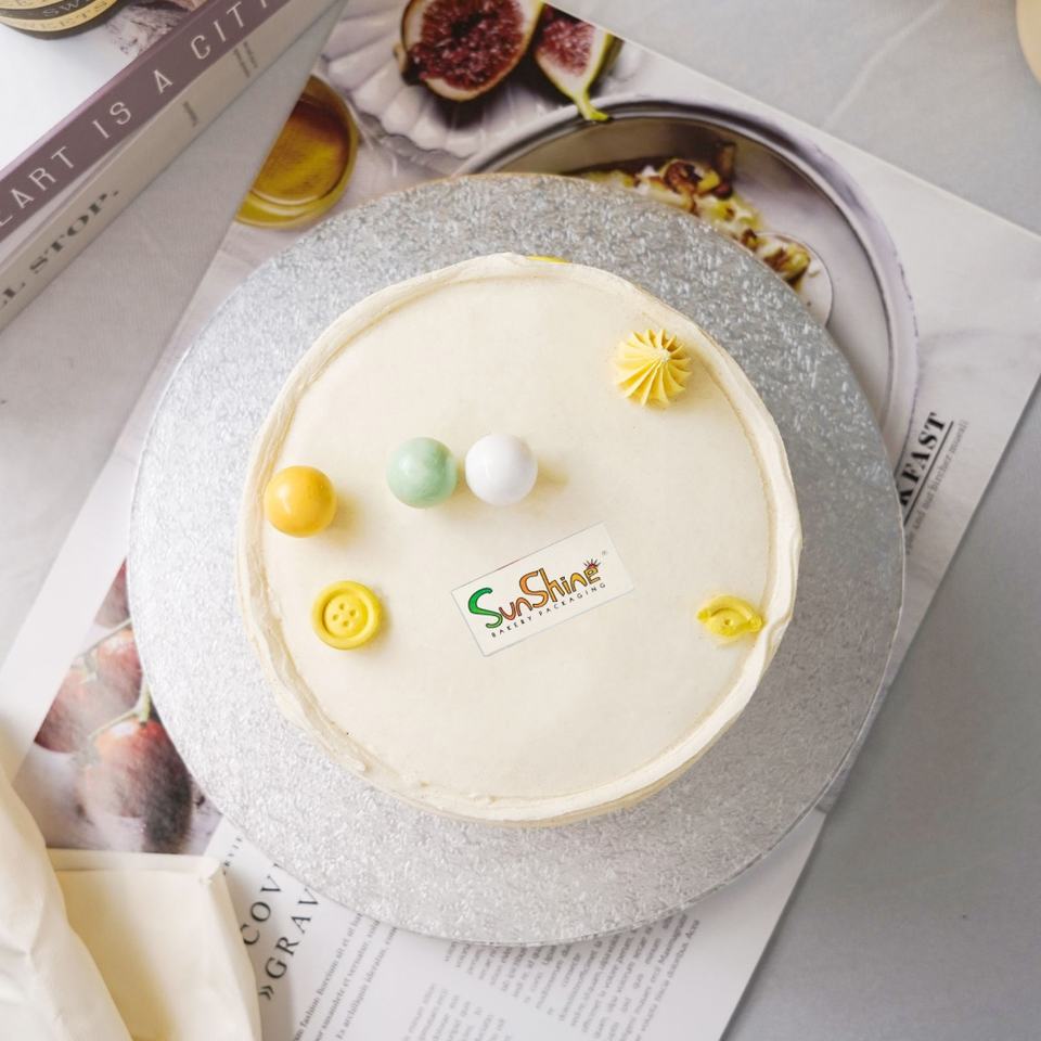 Plateau à gâteau rond personnalisé Sunshine en argent avec gaufrage et impression dorée, base carrée en forme de tambour