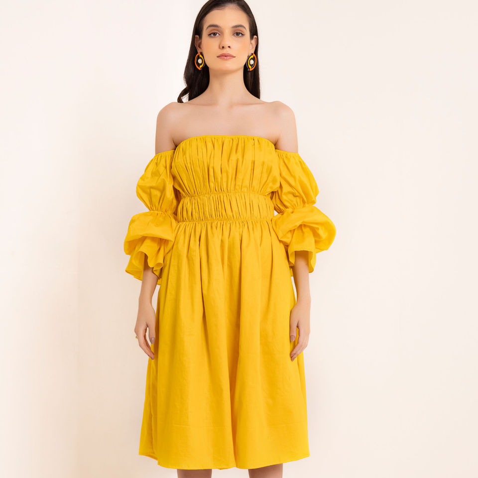 Nom du produit:Robe midi jaune sunstruck à épaules dénudées plissée manches volume