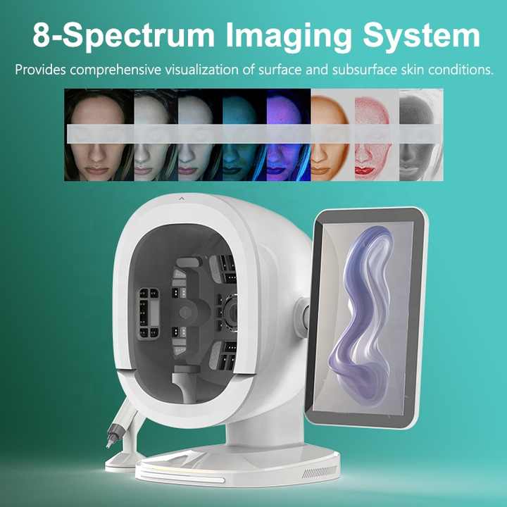 Lumière à 8 spectres: Utilise une lumière à 8 spectres pour une analyse complète de la peau, permettant la détection de multiples conditions cutanées.