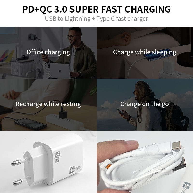 Chargeur mural super rapide 25W A+C avec protection OTP, prise EU, type-C PD pour téléphones mobiles et ordinateurs portables