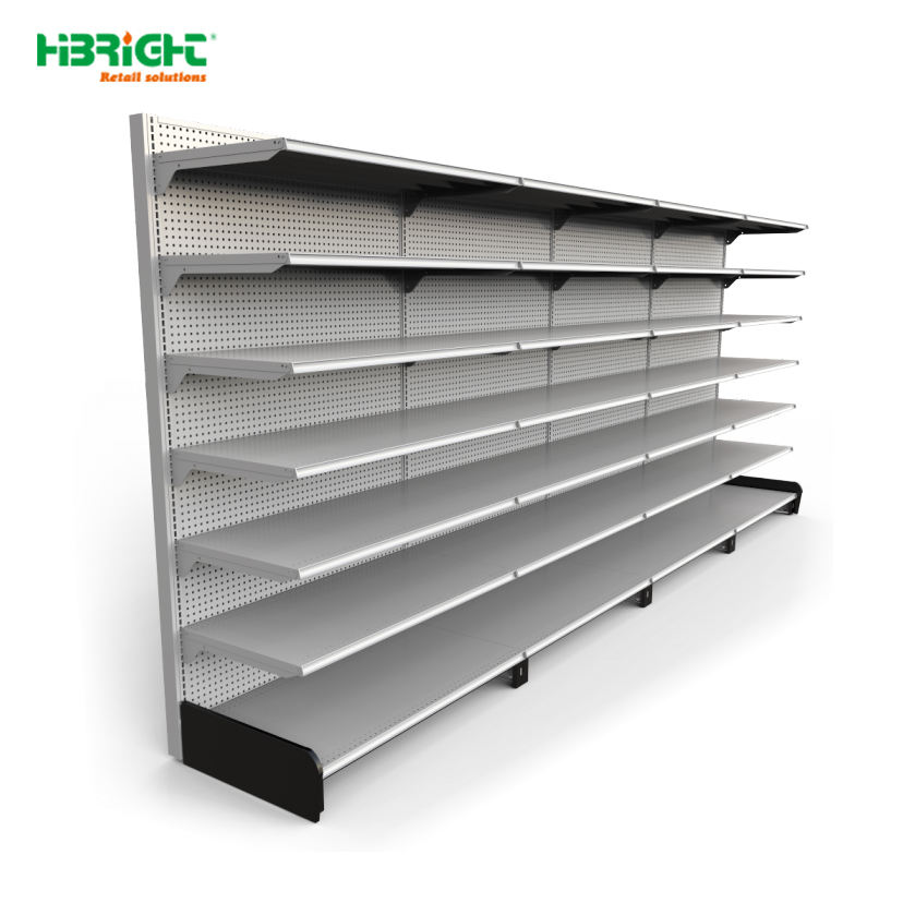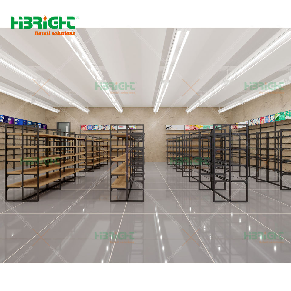 Étagère de présentation de vente au détail en acier/bois double face super résistante Capacité de 100 kg Certifiée ISO9001 Faible MOQ Gondole Supermarché