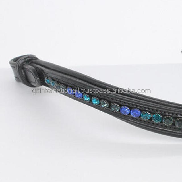 Bandeau de tête pour cheval en cuir rembourré de qualité supérieure, avec une rangée de cristaux de diamant et une chaîne métallique.