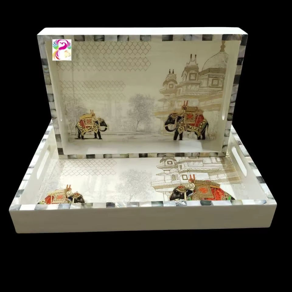 Ensemble de plateau à thé en bois de super qualité-Grands petits plateaux de service Organisateur de cuisine imprimé rectangulaire Service décoratif fait à la main