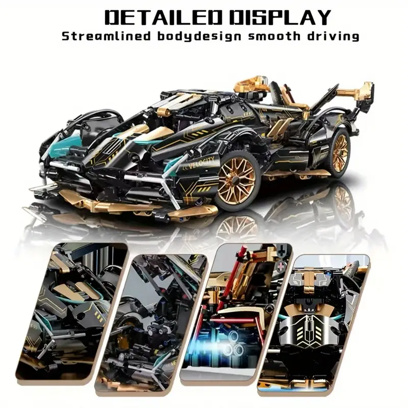 Ensemble de blocs de construction de modèle de voiture de sport super sportive en trois dimensions, décoration de voiture noire et dorée à la mode