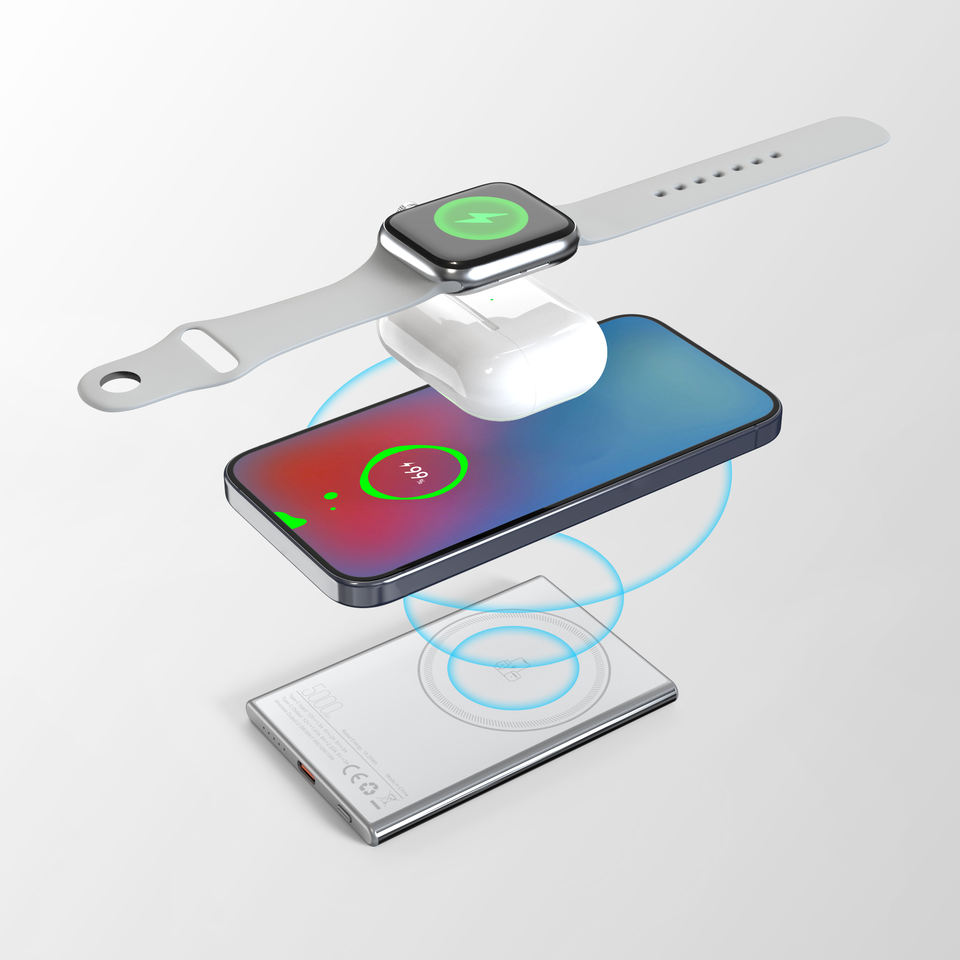 Banque d'alimentation magnétique sans fil super ultra mince 5000mAh pour écouteurs de montre de téléphone Chargeur de batterie de banque d'alimentation 3-en-1 pour téléphone portable