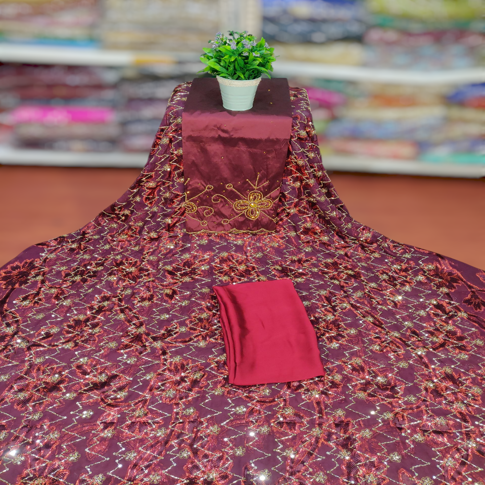 Superior Quality Premium Look Somalian Burgundy Fransawi Dirac Jacquard Plain Fabric with Stone Work Leafy Theme Design
